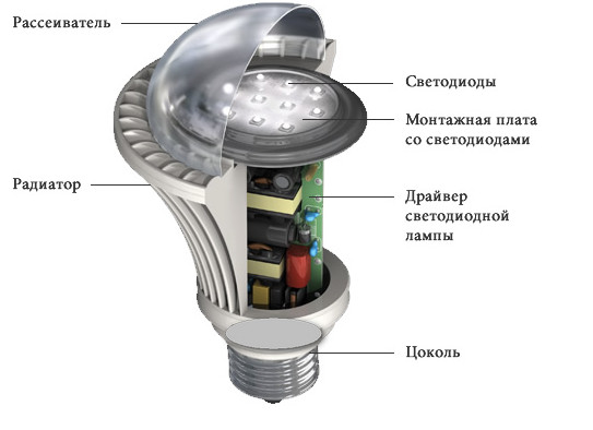 Цялото конструктивно устройство на LED лампа включва следните елементи: