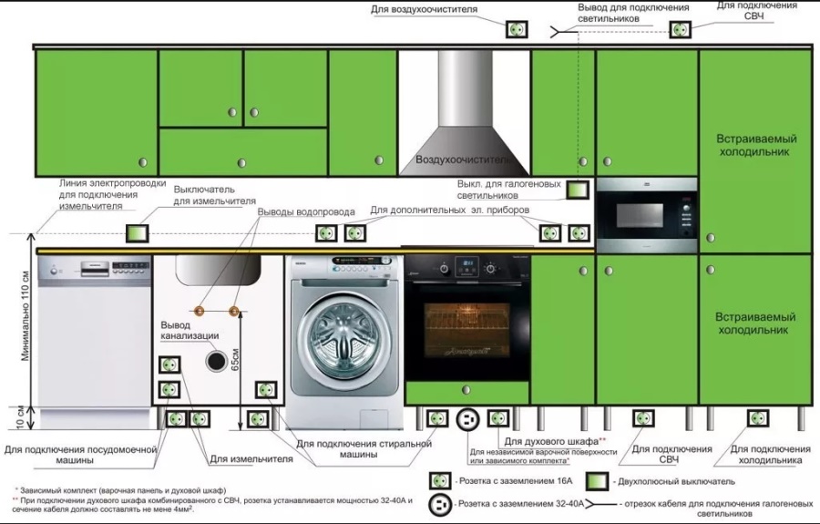 - Клон за изходния блок, който ще включва домакински уреди с ниска мощност (тостер, миксер, микровълнова фурна, сокоизстисквачка, хранителен комбайн и др.). По правило такъв блок от изходи е разположен върху работната стена на ниво 1 м от пода. Обърнете внимание, че това ще включва техники, които се използват периодично, а не през цялото време.