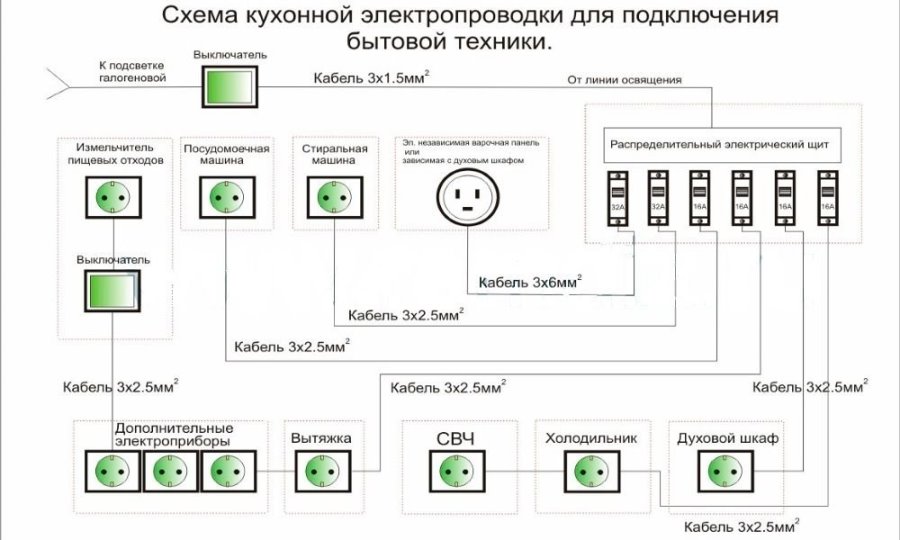 Диаграмата за окабеляване на кухнята включва следните основни елементи: