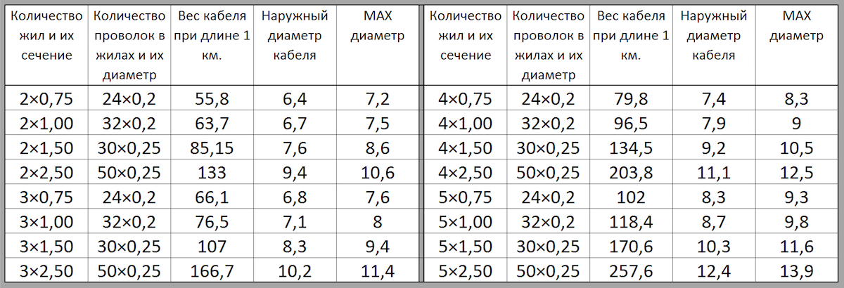 Според броя на проводниците и тяхното напречно сечение, PVA кабелите са от следните видове: