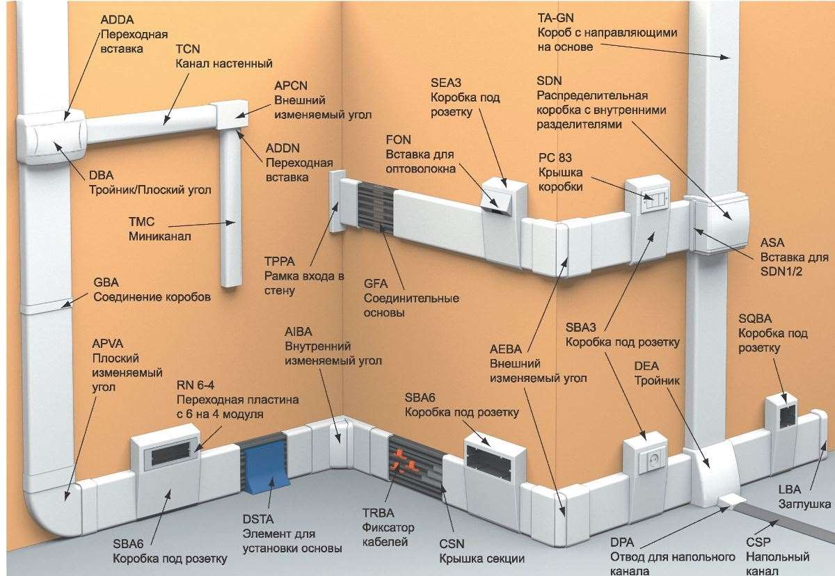 Комплектът за доставка на кабелни канали включва допълнителни елементи (завои, ъгли, кръстове и др.), Които позволяват да се даде на конструкцията монолитен вид по време на инсталирането.