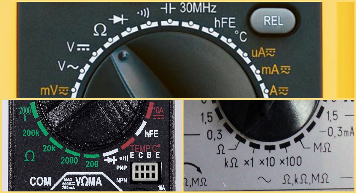 Мултиметърът се управлява с кръгло въртящо се копче, около което се очертава скала, разделена на сектори. Те са разделени една от друга с линии или просто надписите върху тях се различават по цвят. За да превърнете мултицета в режим на омметър, трябва да завъртите копчето в областта на сектора, обозначена с иконата "Ω" (омега). Цифрите, които ще обозначават режимите на работа, могат да бъдат подписани по три начина:
