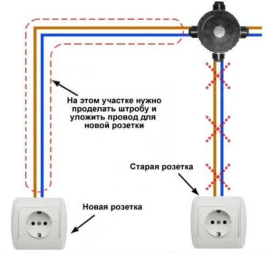 Извършва се по два начина - гнездото се полага от разклонителната кутия, която вече е в стаята, или се прави напълно нова линия директно от глюкомера. Първият метод се използва, когато е необходимо да се актуализира проводникът - например, ако старият е бил изложен на многократно прегряване, което се доказва от втвърдена и разпадаща се изолация. Под мощно устройство се полага нова линия - когато се премества гнездо за електрическа печка, бойлер или климатик.