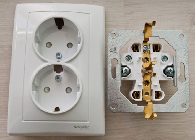 Типичното гнездо е направено от метални контакти, фиксирани в диелектричен корпус. Към всяка от тях се закрепват проводници. Двойно гнездо, инсталирано в едно гнездо, се състои от едни и същи контакти, само че те са направени по краищата на плочата и всеки от тях има болтово закрепване за фазова или неутрална жица. Тъй като медна или месингова плоча във всеки случай има по-голяма пропускателна способност от проводник, той е този, който е потенциална "слаба връзка", следователно, когато свързвате двоен гнездо, затягането на контактите трябва да се вземе с цялото внимание.
