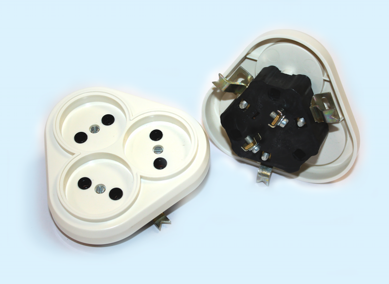Схематичната схема за свързване на троен изход не се различава от двойна еднофазна и нула се подава към контактите, които са на медни или месингови плочи. Между себе си тройните гнезда се отличават структурно чрез триъгълни или панделки. Втората им версия е една и съща двойна, но с допълнителен гнездо за трети щепсел - всички контакти са на твърди плочи. Триъгълните, от своя страна, трябва да бъдат направени от няколко парчета, свързвайки ги заедно с нитове. Теоретично това донякъде намалява надеждността на контактите, но ако не нарушите правилата за работа, тогава триъгълният троен гнездо, инсталиран в един гнездо, ще работи без оплаквания в продължение на много години.