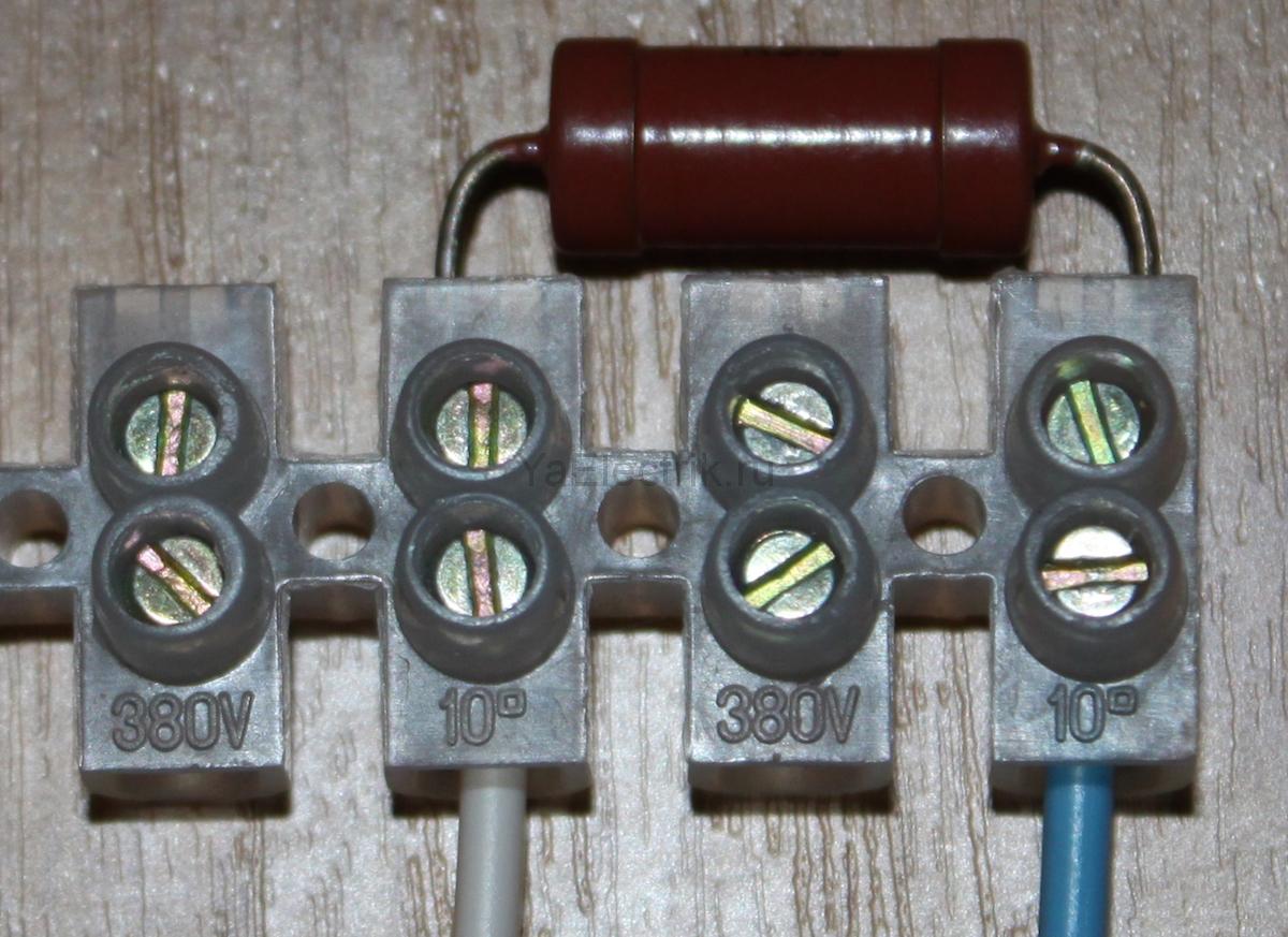 Обърнете внимание, че свързването на резистора в разклонителната кутия е много по-надеждно, отколкото в контакта, тъй като в него има достатъчно място за инсталиране на клемния блок. Ако все още няма достатъчно място, можете да го поставите директно в полилея, ако дизайнът му позволява. В този случай резисторът е в същото отделение като проводниците. В този случай трябва да се погрижите за надеждната му изолация, особено ако частите на полилея са метални.