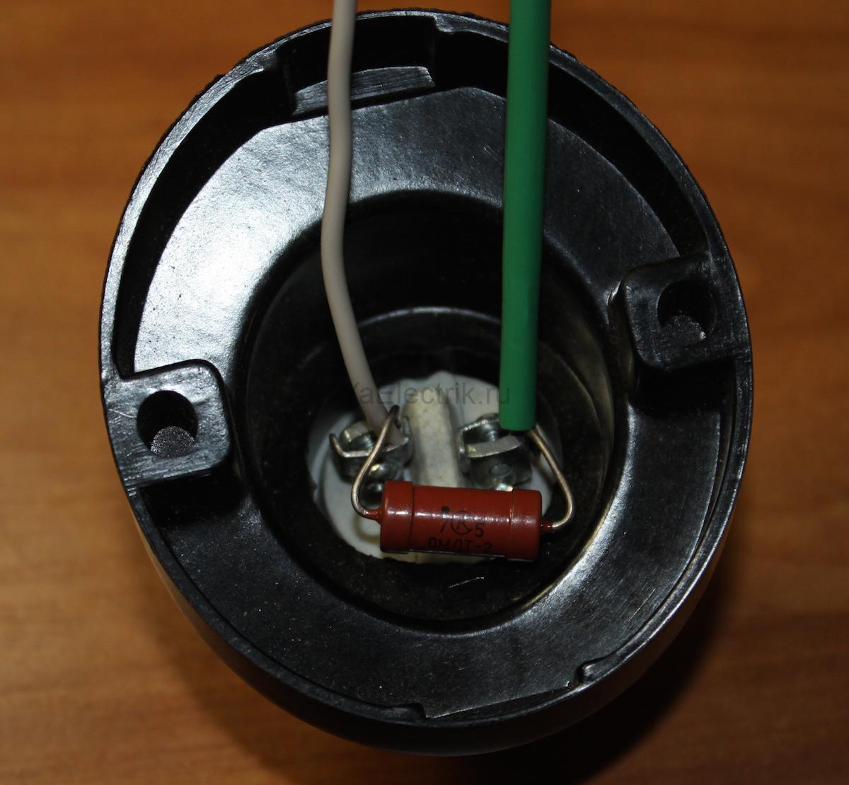 Снимката по-долу показва опцията за свързване на резистор в държача на лампата. Неговите проводници са захванати в клеми за захранващи проводници.
