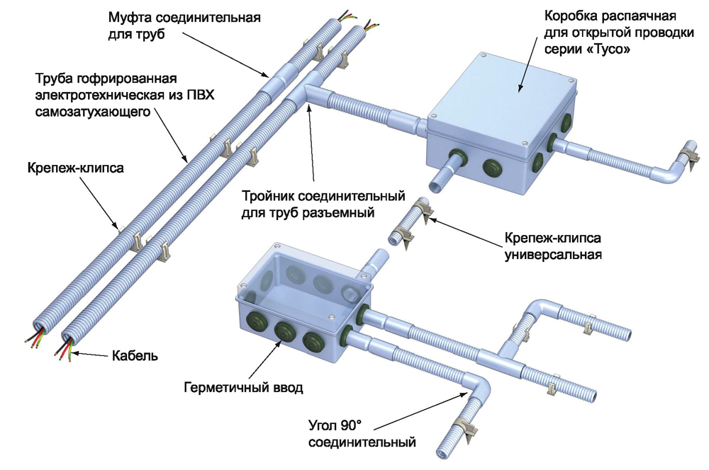 По принцип инсталирането на открито окабеляване в тръби е доста работещ метод, който ви позволява надеждно да защитите кабелите от повреди и да придадете на линията елегантност.