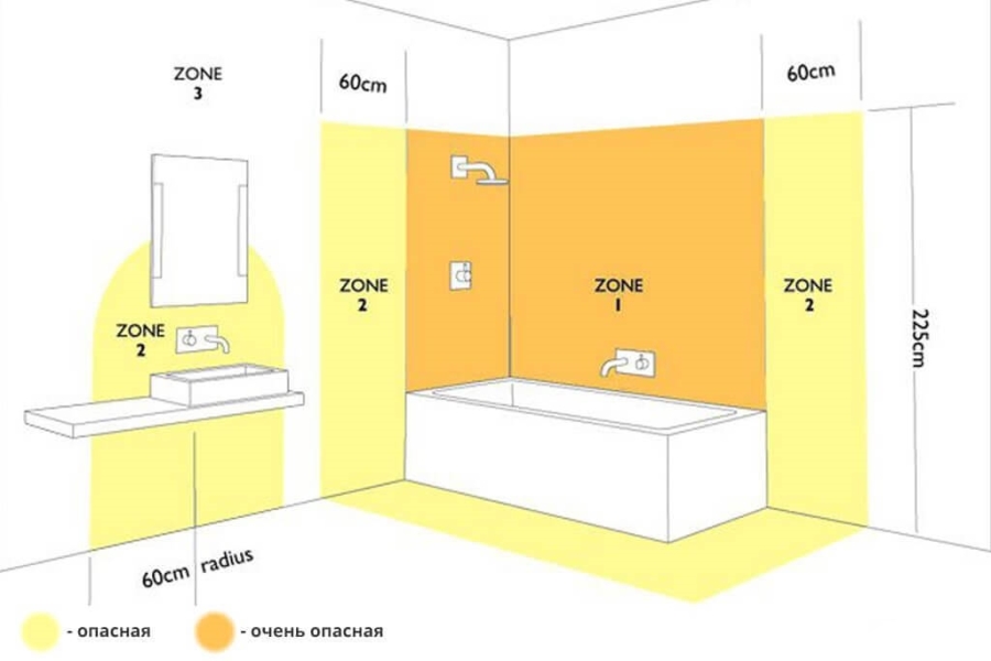 Поставянето на търговски обекти в тази стая също се превърна в необходимост. Свързват пералня, електрическа самобръсначка, сешоар, а при липса на топла вода в къщата - електрически бойлер. Правилата за електрическа инсталация посочват, че точките на захранване не трябва да бъдат разположени в близост до банята (душ), а разстоянието между тях трябва да бъде най-малко 0,6 m.