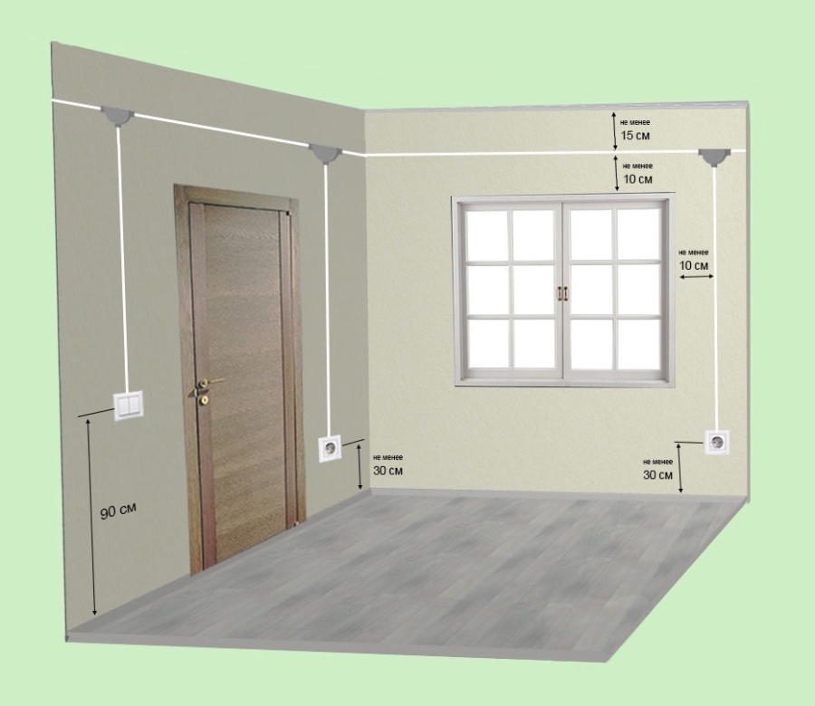 Необходимо е също така да поставите силови елементи близо до вратата, в които може да се свърже прахосмукачка или електрическа камина.