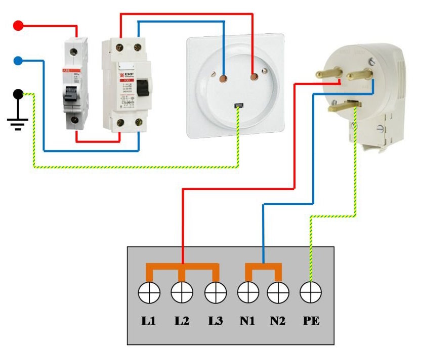 Еднофазният електрически контакт е по-голям от конвенционалния и може да достави фаза, работна нула и земя на устройството. Ако апартаментът не осигурява заземяване, тогава един контакт остава празен.