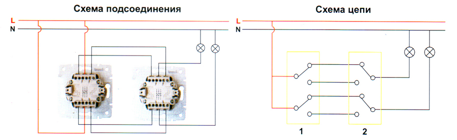 Първият превключвател има още два терминала "L1" и "L2", към които фазовият проводник е свързан от захранващата мрежа. Във втория превключвател терминалите с надпис "L1" и "L2" са свързани съответно към две осветителни тела. Такива връзки се правят с двужилен проводник.