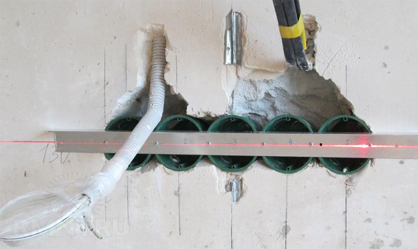 - Монтирането на контакти на гнездото в бетон започва с маркиране. Ако има само един гнездо на стената, тогава плюс или минус сантиметър няма да играе роля, но когато блокът от изводи е инсталиран, тогава колко гладко ще бъде изложен впоследствие зависи от правилната маркировка.
