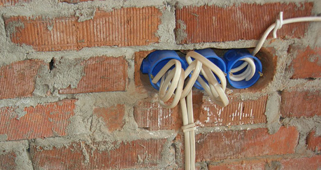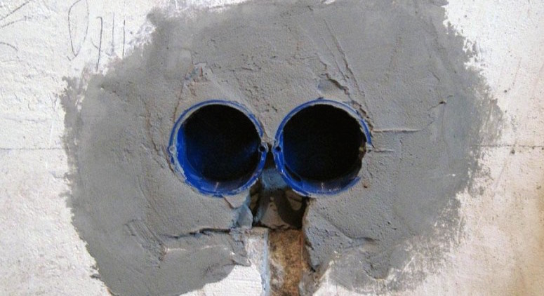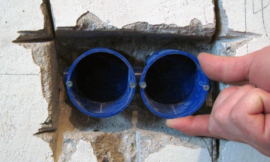 - Поставяне на гнездо. Необходимо е да монтирате гнездото, което е монтирано на промивка, в бетонната стена, а също така да проверите дали кабелът може свободно да влезе в него. Тъй като замазката ще бъде нанесена допълнително в дупката, по-добре е предварително да увиете края на жицата с електрическа лента, ако това не е било направено преди.
