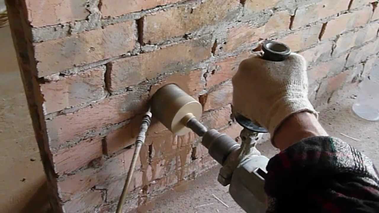- Пробийте с коронки за пробиване на кутии за гнезда. Ако няма корони, тогава просто тренировка за бетон (или за дърво, в редкия случай, когато скрита окабеляване е монтирана в дървена стена). Моторна бормашина или нейният режим на тренировка също може да ви бъде полезна.