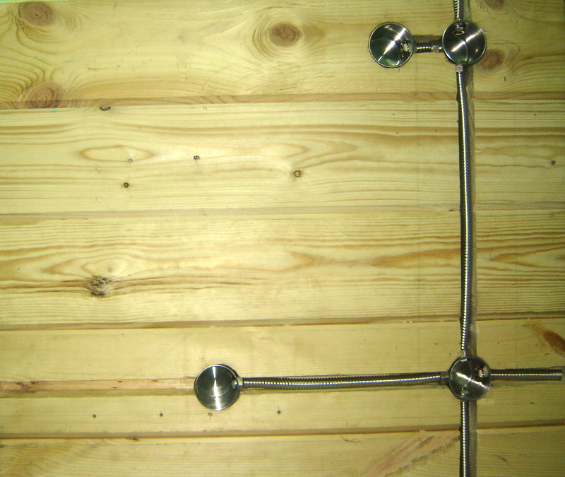 По същата причина проводниците в такова окабеляване трябва да бъдат положени в желязна тръба и всичките му фуги с гнездото трябва да бъдат внимателно запечатани. Цялата линия е задължително заземена, следователно, закрепващ болт за заземяващия проводник е допълнително заварен към краищата на тръбите, които се сближават в кутията на гнездото.