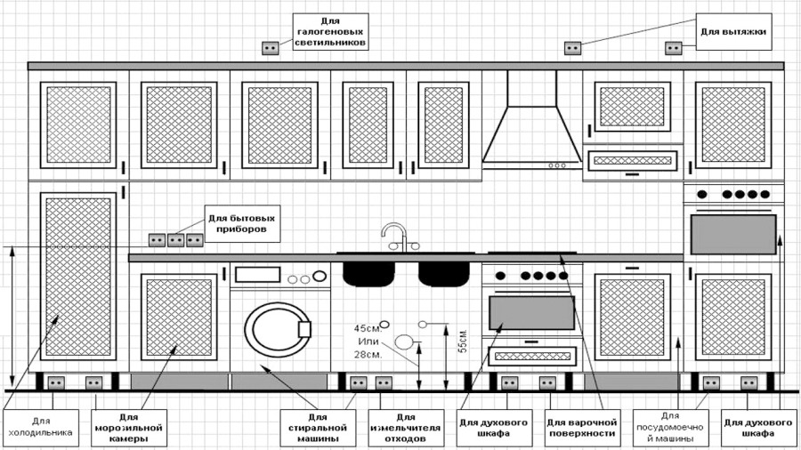 - Първото ниво (или по-ниско) е 0,15-0,20 м. На това ниво са монтирани гнезда за електрически уреди, които изискват постоянна или дългосрочна връзка с мрежата (пералня, миялна машина, хладилник, електрическа печка, шредер за отпадъци).