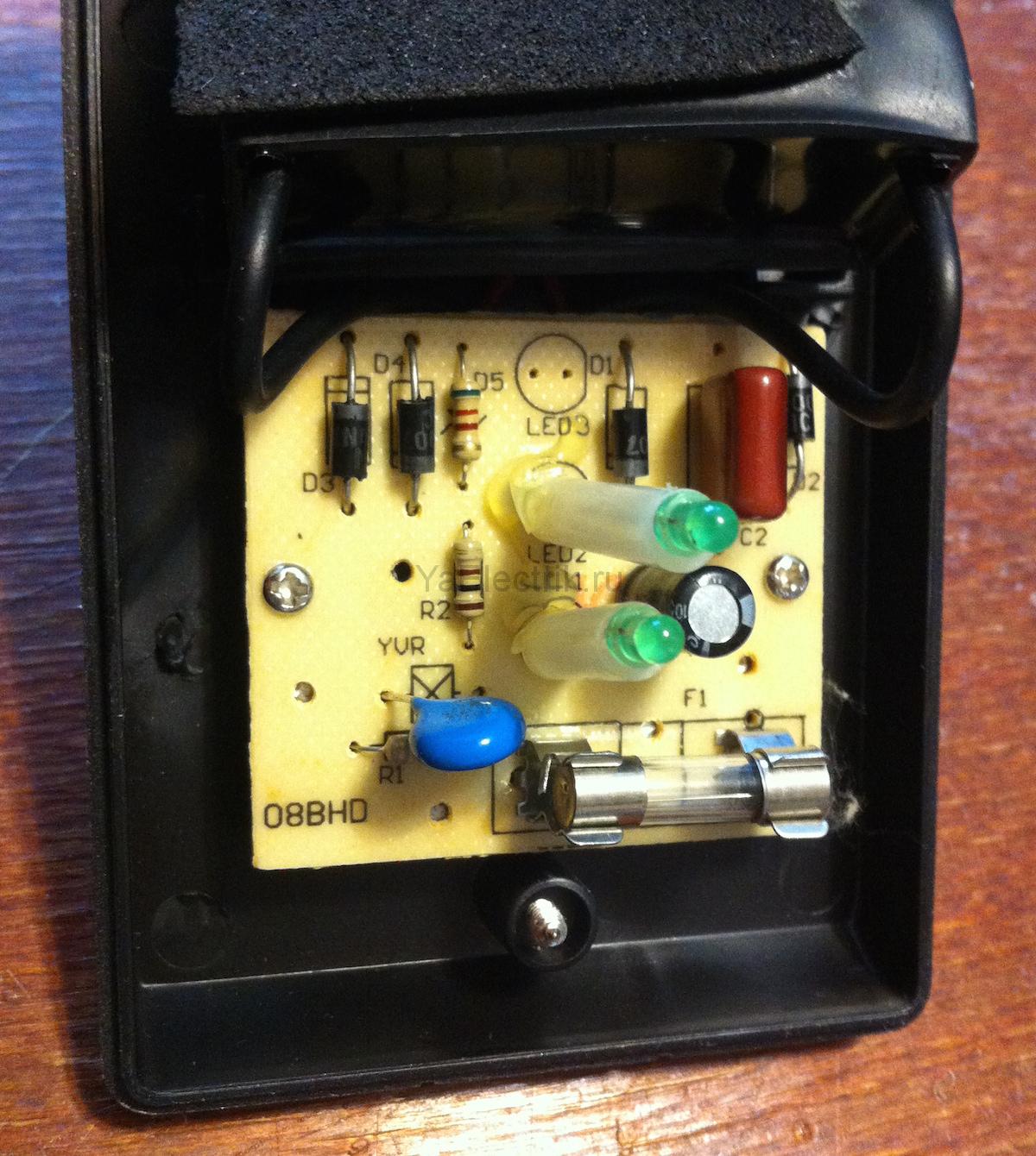 Развивайки един винт, който държи двете половини на корпуса заедно, можете да видите малка електронна платка с минимум компоненти и филмов кондензатор (капацитетът й е малък, около 6 микрофарада). Ако внимателно изучите схемата, сглобена на платката, ще разберете, че тя просто осигурява LED индикация.