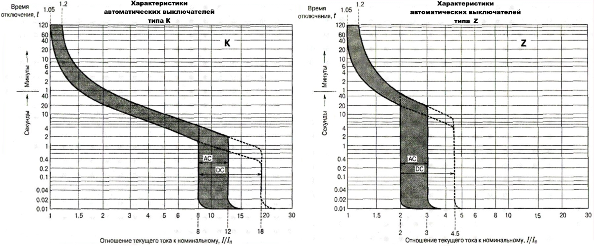 Устройствата от тип Z също имат различни експлоатационни токове на електромагнитното освобождаване на соленоида, но разпръскването не е толкова голямо, колкото при AB категория К. 4,5 пъти по-голяма от номиналната.
